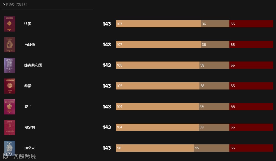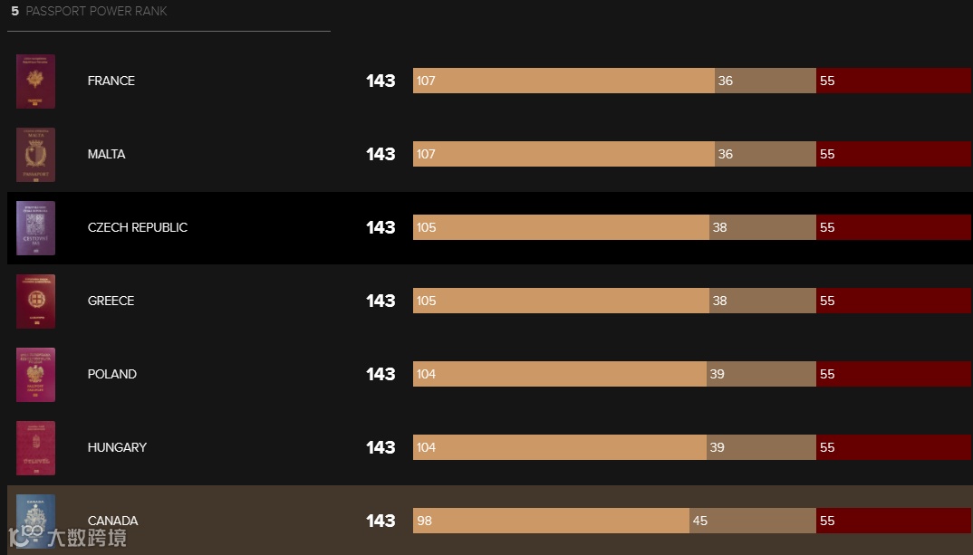 No.5同样有7个国家,分别是法国、马耳他、捷克、希腊、波兰、匈牙利、加拿大。