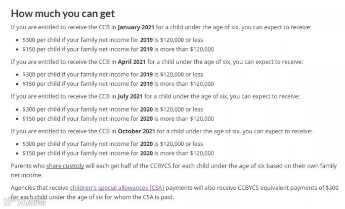2020年净收入为$12万或以下的家庭,每名6岁以下的儿童可获4次、每次补助的上限为$300加币;