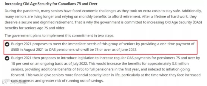 不仅仅是补助,2021年联邦预算还包括OAS福利金的永久10%增加,此措施将在2022年7月实施,目标是75岁及以上的老人,在第一年为全额OAS福利金领取者提供额外的766加币。