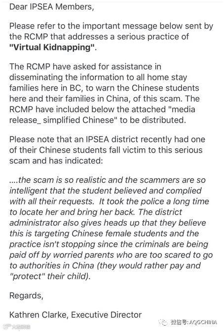 我司安侨公司收到来自加拿大BC省国际公立学校教育协会(IPSEA)执行董事Kathren Clarke的邮件,提醒我们在BC省就读的学生及她们在中国的学生家长请勿相信“虚拟绑架”骗局。