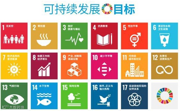 1. 无贫穷、2. 零饥饿、3. 良好健康与福祉、4. 优质教育、5. 性别平等、6. 清洁用水和卫生设施、7. 经济适用的清洁能源、8. 体面工作和经济增长、9. 产业、创新和基础设施、10. 减少不平等、11. 可持续城市和社区、12. 负责任消费和生产、13. 气候行动、14. 水下生物、15. 陆地生物、16. 和平、正义与强大机构、17. 促进目标实现的伙伴关系