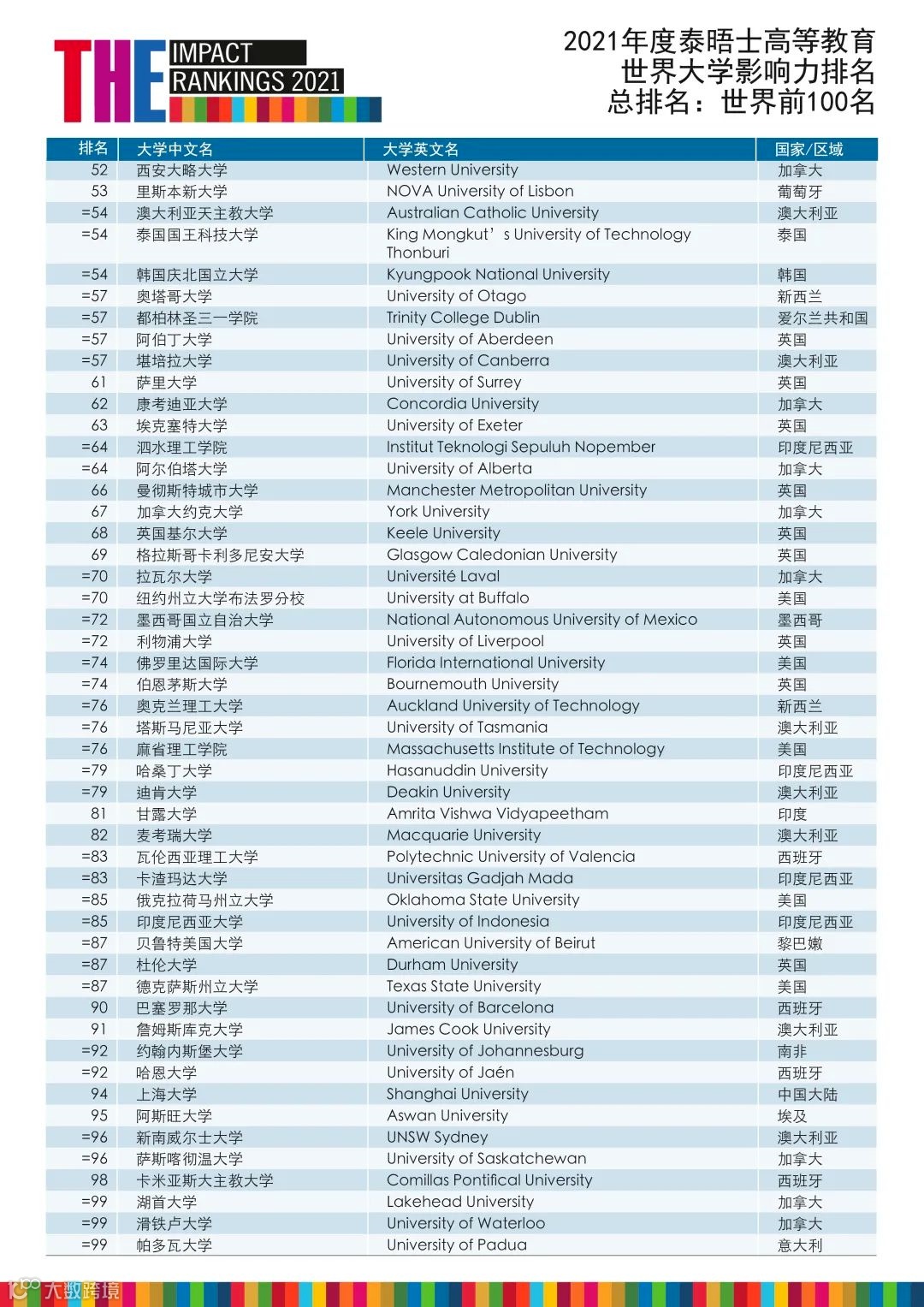 泰晤士报高等教育网(THE)发布了最新的《2021年世界大学影响力排名》。