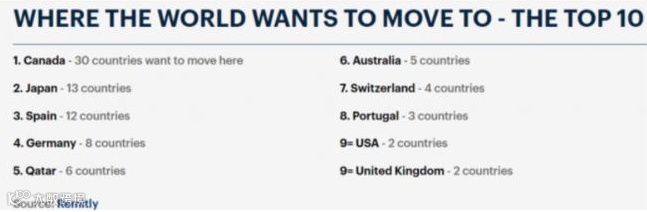 Remitly 公布的“世界十大移民首选国”分别为:加拿大、日本、西班牙、德国、卡塔尔、澳洲、瑞士、葡萄牙、美国和英国(并列第九位)。