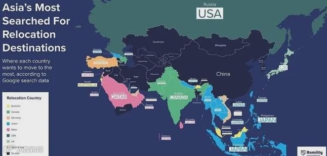 于是,一家叫做Remitly的公司也闲得无聊做了一个调查:世界各国搜索“如何移民出国”(how to move abroad)以及他们的出国目的地关键字词条。