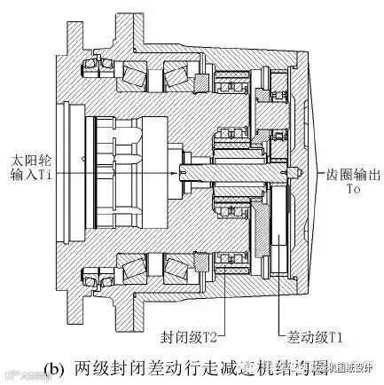 在行走减速机应用初期,其结构形式主要是平行轴加行星轮系复合结构,如图 3-1(a)所示,该结构形式的行走减速机体积大,占空间,且平行轴级承载能力十分有限,故障率较高;经过较长时间发展和改进,目前,行走减速机普遍采用是封闭差动行星齿轮传动设计。本课题所采用的结构形式是适用于传动比大,承载扭矩大以及空间尺寸有限制的履带式两级封闭差动行走减速机,传动结构图如图 3-1(b)所示。