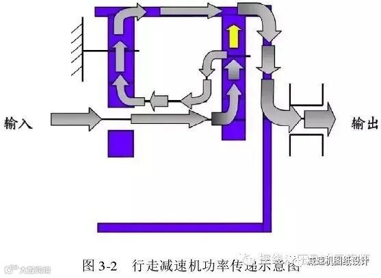 行走减速机通过液压马达驱动输入太阳轮,经过轮系的减速,最后将增大的扭矩通过齿圈输出;行走马达输出轴和两级封闭差动共轴线、两级行星轮均布的结构形式保证了传动轴线的同轴度,使行星轮公转产生的离心惯性力得到有效地平衡,减少了主轴承因不平衡齿轮啮合力对其使用寿命的影响,同时充分利用了内啮合承载能力高和齿圈本身的可容体积及径向尺寸的特点,极大地缩小了整机的径向尺寸;该结构典型的功率分流特点使太阳轮和行星轮等易损件所承受的载荷较小,保证部件的使用寿命,而经再合流输出的功率仍然能满足整机较大的承载能力;并且,行星架、太阳轮等易损传动部件采用浮动式结构,能实现自动调整定心,减少冲击和碰撞,同时装配方便,轴向尺寸小。