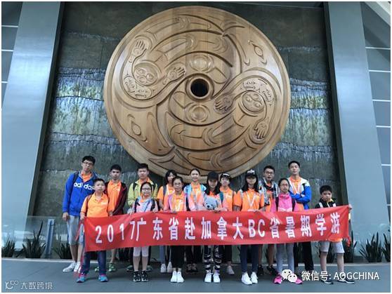 15名来自广州市越秀区恒福中学和八一实验学校的学生抵达温哥华机场,在原住民图腾下合照
