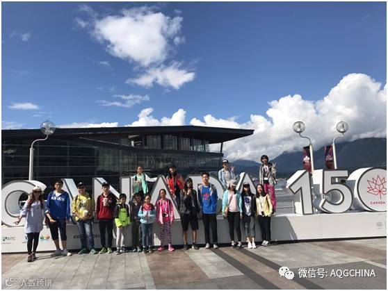 图为学生们在温哥华市中心广场为今年加拿大建国150周年特设的纪念标牌旁合照