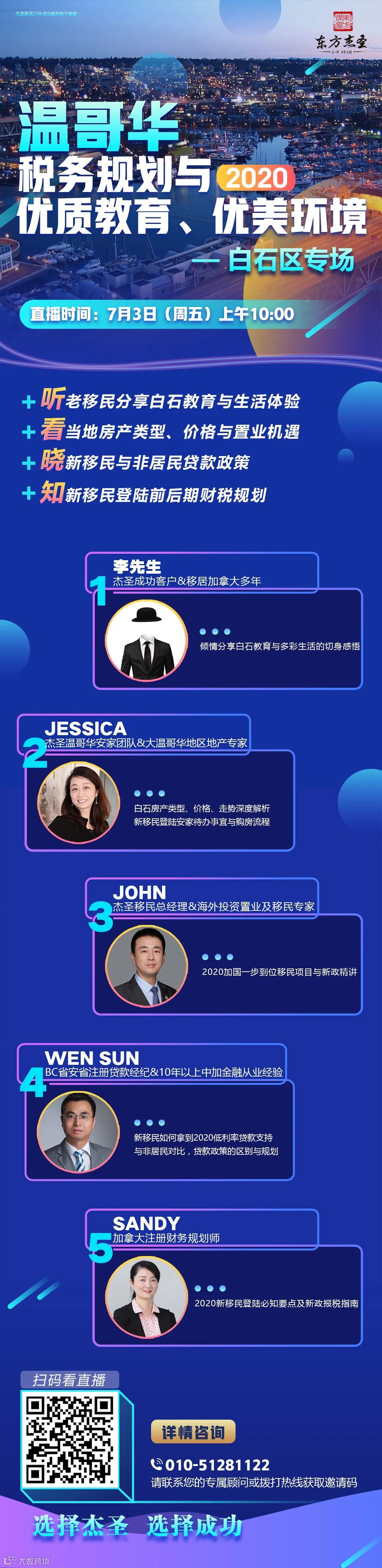 新移民登陆如何规划财富税务?2020下半年地产走势有何变动?当地公立私立学校全面指导。尽在7月3日(周五)上午10:00——杰圣移民2020温哥华财务规划与优质教育、优美环境 - 白石区专场。