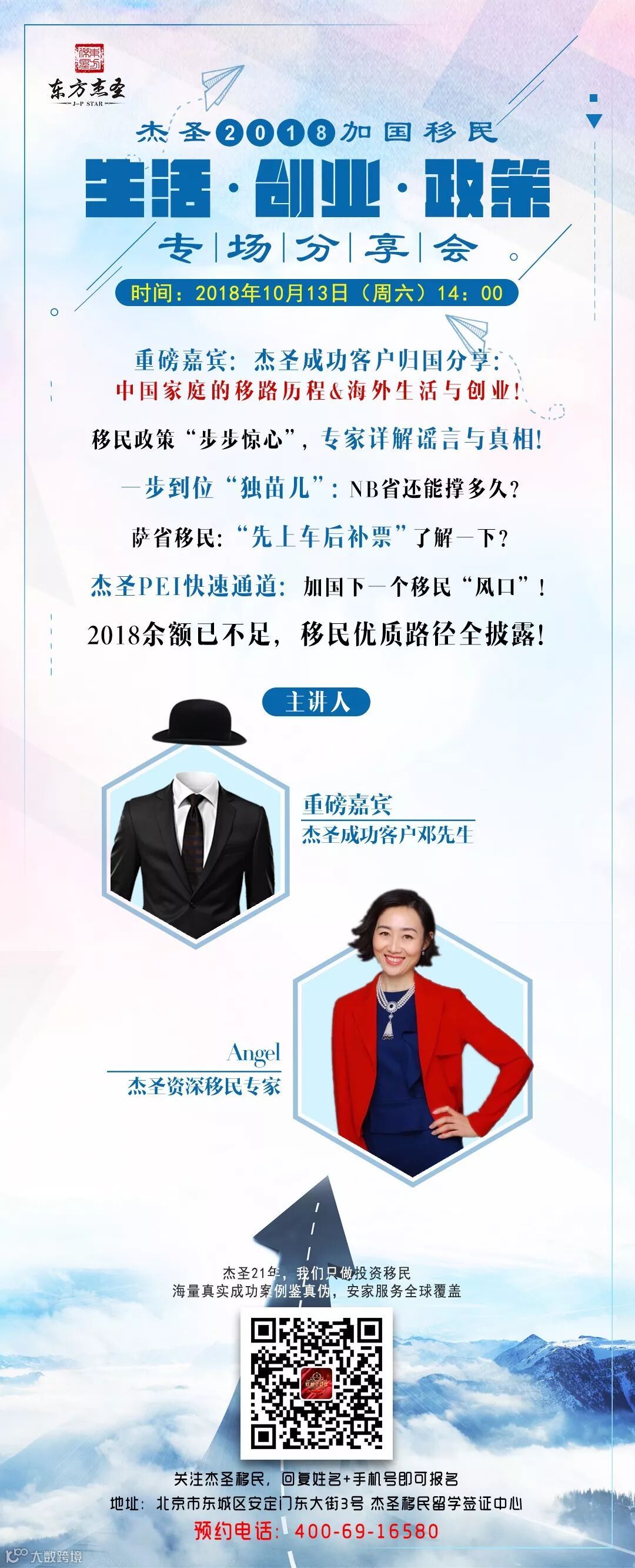 活动预告:为了帮助各位对自己家庭的移民规划能有更全面的把控,杰圣特在2018年10月13日(周六)下午14:00举办一场杰圣2018加国移民专场讲座会,现场特邀重磅嘉宾——杰圣成功客户邓先生,携手杰圣资深移民顾问,从生活·创业·政策多方位为您详解!更多精彩,敬请期待!