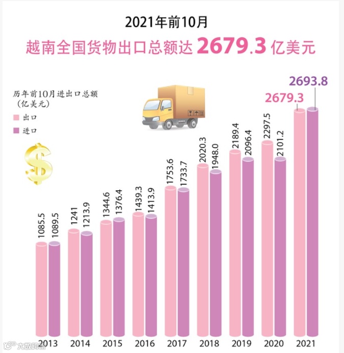 越南统计总局公布的数据显示,越南全国2021年10月货物出口额为273亿美元,环比增长1%,同比增长0.3%。累计前10月货物出口总额达2679.3亿美元,同比增长16.6%。
