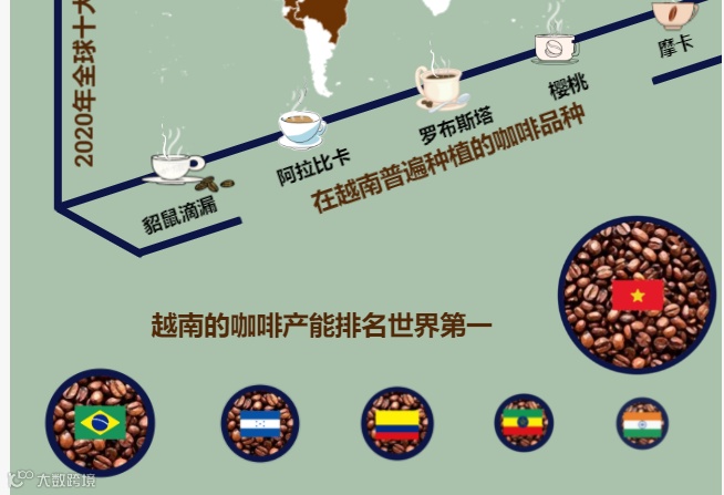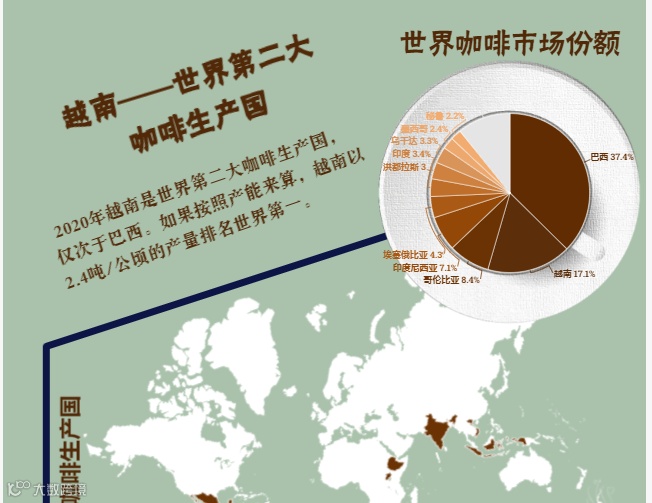 2020年越南是世界第二大咖啡生产国,仅次于巴西。如果按照产能来算,越南以2.4吨一公顷的产量排名世界第一。