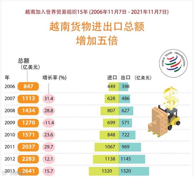 回顾越南加入世界贸易组织(WTO)15年(2006.11.7-2021.11.7)征程,越南在一体化道路上迈出了一大步。越南已经和正在就17项自由贸易协定(FTA)进行谈判,其中,已15项自贸协定已得到签署并生效。特别是,一体化进程也得到有效利用,将出口增长与有效管控进口活动相结合,将贸易平衡从贸易逆差转为贸易顺差。