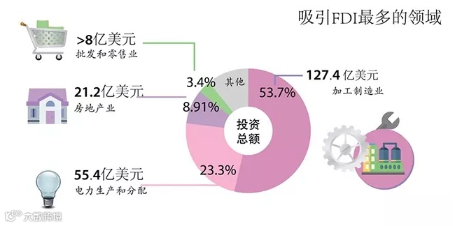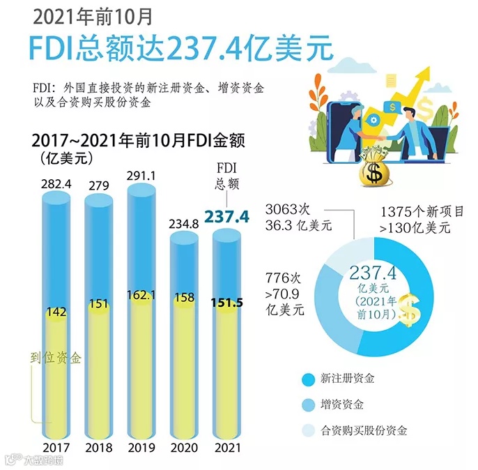 据越南计划投资部的统计数据显示,截至2021年10月20日,外国投资商累计新增、增资和扩股资金达237.4亿美元,比2020年同期增长了1.1%。