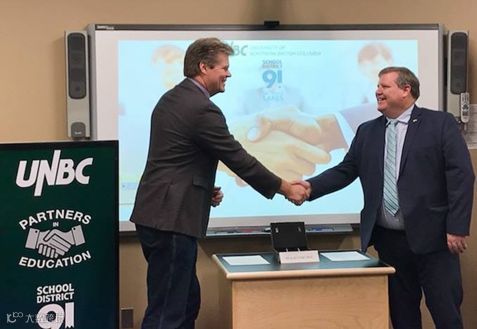 UNBC(北英属哥伦比亚大学UniversityOf Northern British Columbia)教务长兼副校长Dan Ryan博士与教育局局长Eugene Marks先生一起签署了UNBC和SD91之间的合作谅解备忘录。SD91很荣幸能将UNBC作为创建世界的合作伙伴,为我们的学生、我们的学校和我们的社区提供一流的学习机会。
