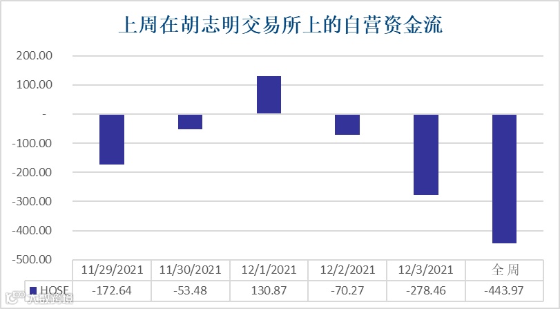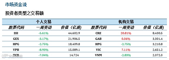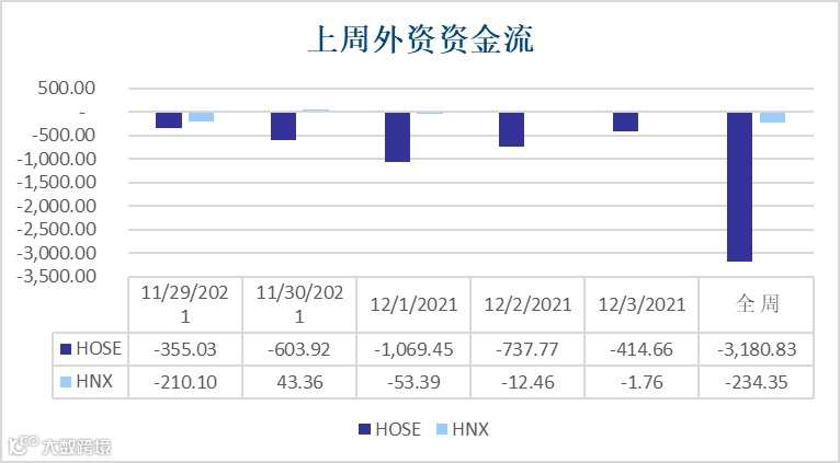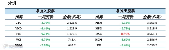 上周,在胡志明交易所上,外资及自营的净售分别为3.180万亿越盾及4430亿越盾,个人及国内机构的净购额分别为3.364万亿越盾及2600亿越盾。在河内交易所上,外资也净售逾2000亿越盾。。