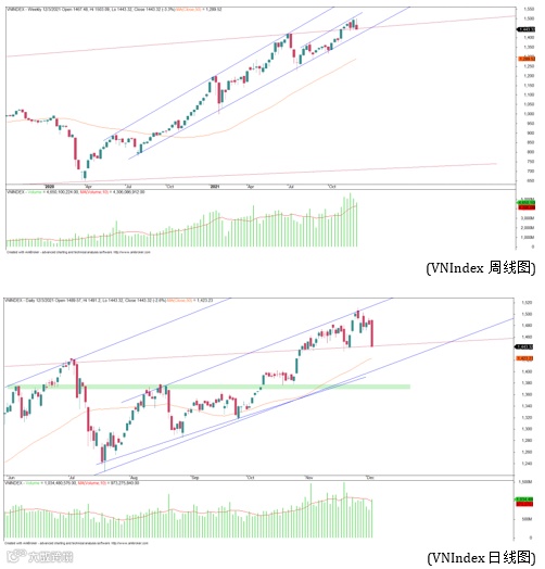 实际上,越南股市下跌趋势相当独立,上周新冠肺炎新变种Omicron出现以及美联储FED的利空信息出现时,越南股市仍持稳。但随后也走弱,上周五就暴跌。VNINDEX指数下降3.33%,包括VN30板块和Midcap板块的VN100板块具有同样的跌幅。Smallcap板块跌幅最小,相当于1.1%。成交量有所下降,从上周一到上周四市场走弱,反映了资金流的谨慎。