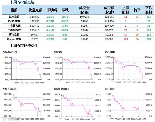 上周VNINDEX下降3.3%,是2021年7月份以来跌幅最大的一周。全周开盘点高于参考点并低于周中最高点位,收盘点低于开盘点并成为周中最低点位。整周的成交量低于前一周并略高于平均水平。