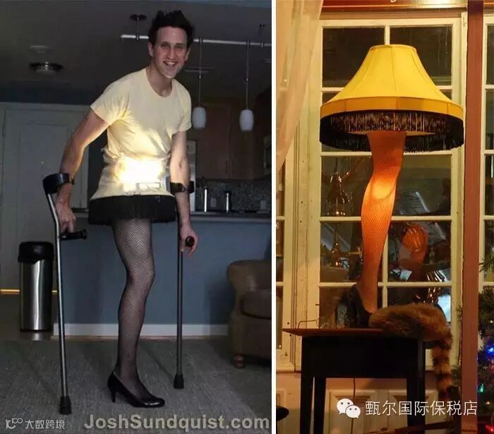 ▼2012年Josh的妻子建议自己装扮成电影《圣诞故事》中的灯具。在家人的帮助下Josh穿上黑色丝袜成了灯具,而且真的找来照明装置让自己看起来更像一盏灯。