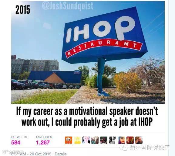▼他在twitter上发了今年的广告牌造型,“如果励志演说家事业走不下去了,我没准能在iHop(美国一餐馆)里找一个工作。“