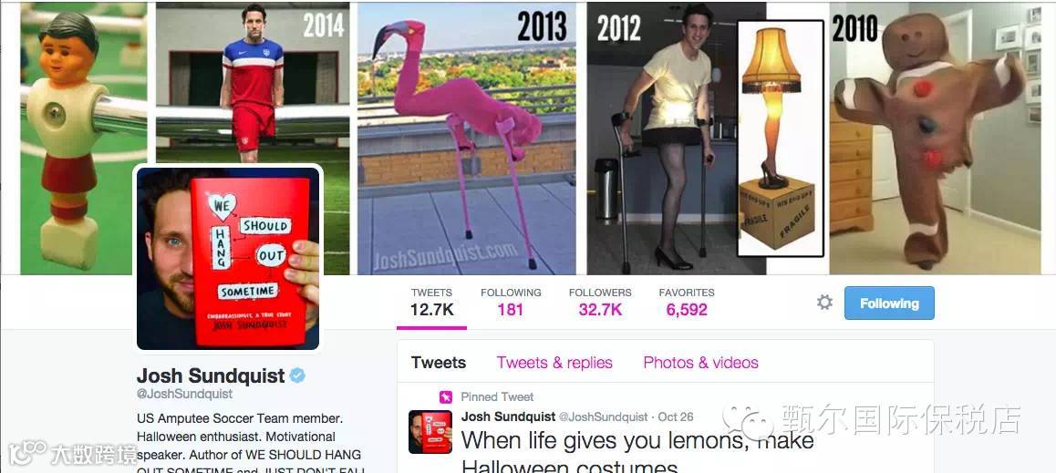 每年的万圣节都会有很多人凭借出色的创意装扮吸引人们的眼球。在这些创意十足的装扮者中,最让人印象深刻的是Josh Sundquist。他九岁那年罹患骨癌,医生说他有50%幸存的可能。在一年的治疗过程中,他被截去左腿。Josh终于在13岁时完全康复,几年后他开始参加滑雪运动。他毕业于美国第二历史悠久的威廉玛丽学院,后来又在南加州大学完成了交流学硕士学位。失去左腿并没有阻止他对人生快乐的追求,反而激发了他无限的动力。