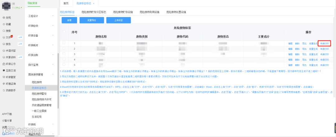 1. 依次点击左菜单环保管家,进入环保管家后点击固体废物管理,点击危废标签标志。