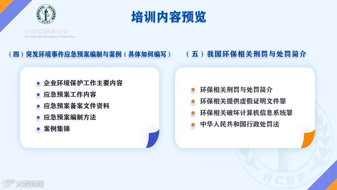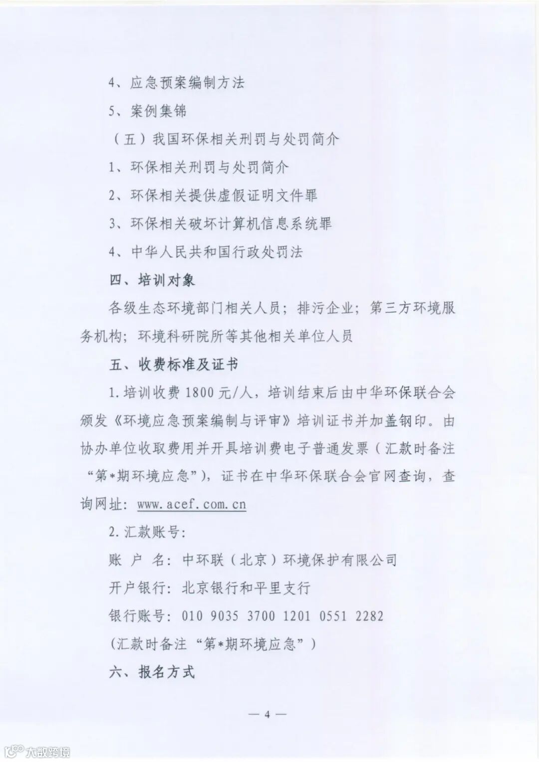 培训收费1800元/人,培训结束后由中华环保联合会颁发《环境应急预案编制与评审》培训证书并加盖钢印。由协办单位收取费用并开具培训费电子普通发票(汇款时备注“第*期环境应急”),证书在中华环保联合会官网查询,查询网址:www.acef.com.cn