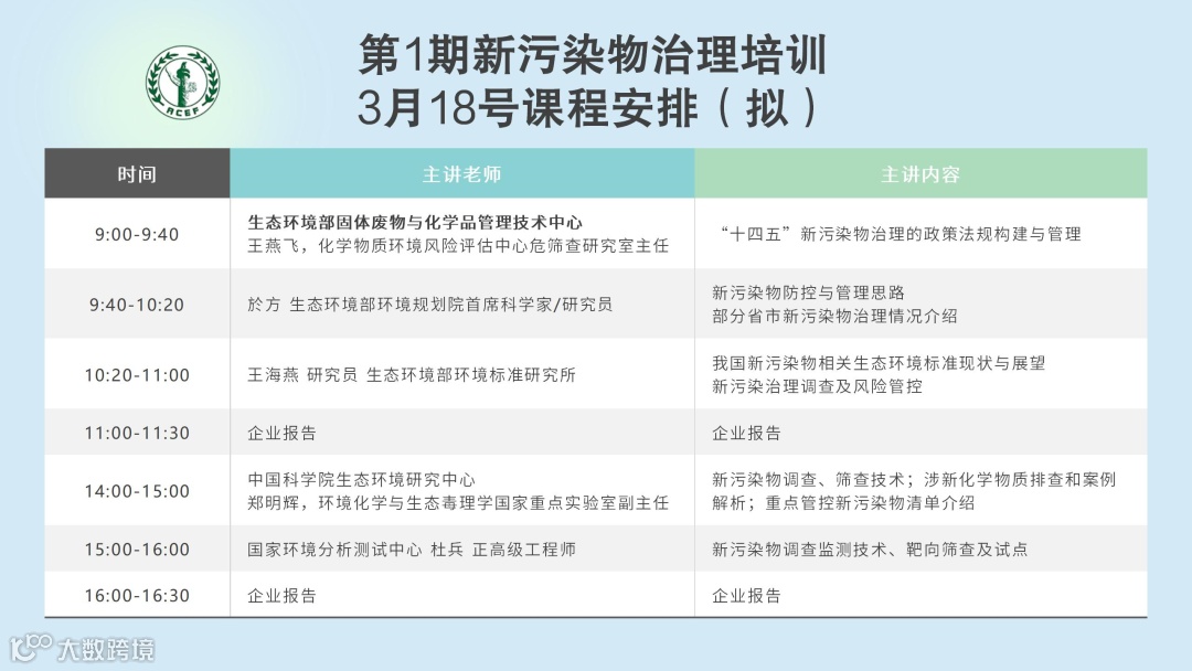 邀请来自生态环境部固管中心、部环境规划院、部标准所、中科院生态环境研究中心、国家环境分析测试中心等国内权威机构的专家授课,日程安排如下: