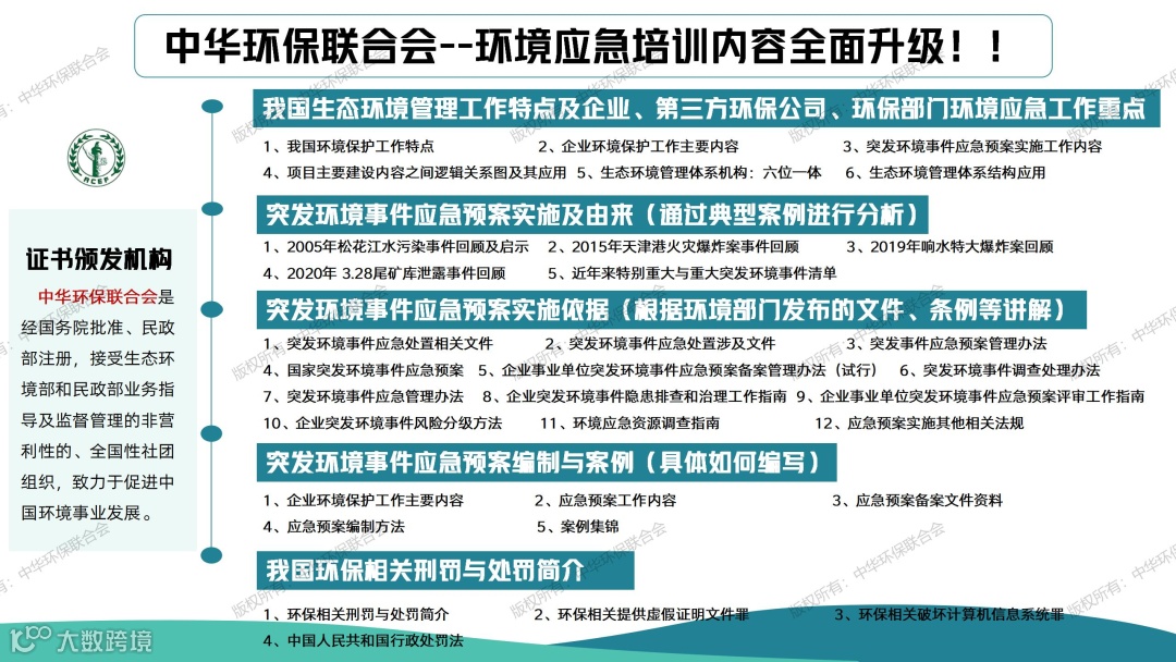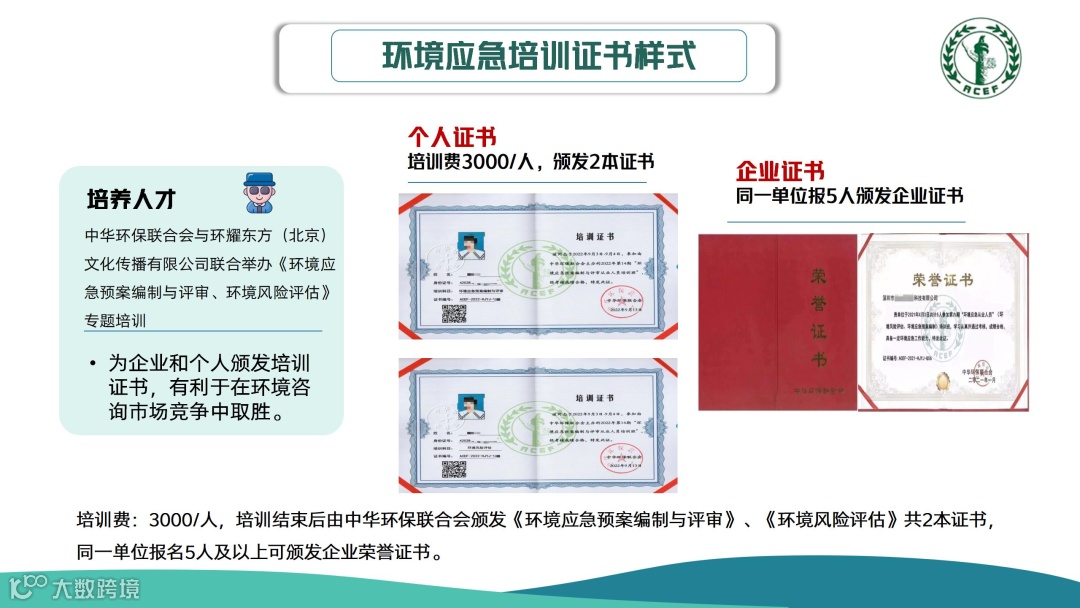 培训费:3000/人,培训结束后由中华环保联合会颁发《环境应急预案编制与评审》、《环境风险评估》共2本证书,同一单位报名5人及以上可颁发企业荣誉证书。证书可在中华环保联合会官网查询。