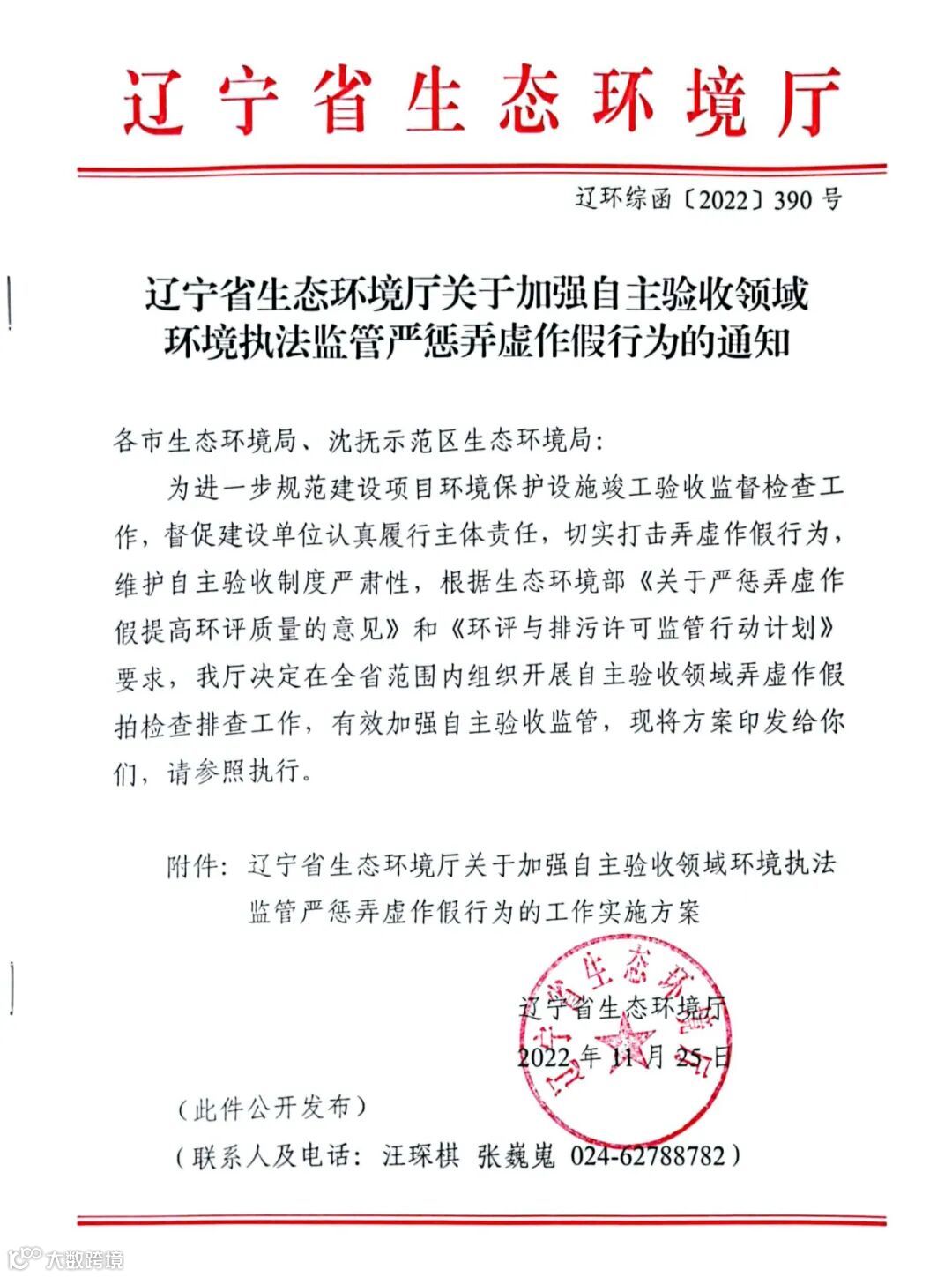 辽环综函〔2022〕390号 关于加强自主验收领域环境执法监管严惩弄虚作假行为的通知