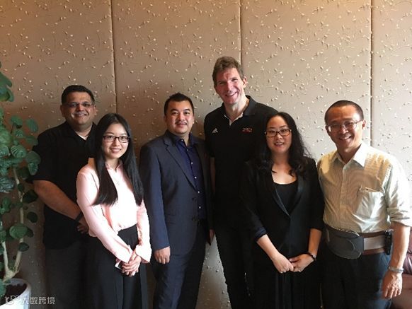 2016年5月,兰加拉学院校长兼CEO莱恩·特罗特先生(Lane Trotter)(右三)、副校长阿杰伊·帕特尔先生(Ajay Patel)(左一)、国际营销及商务发展中国区副总监韩锡安先生(Sik On Hon )(右一)访问AQG深圳公司,双方确定长期共赢的策略性计划。