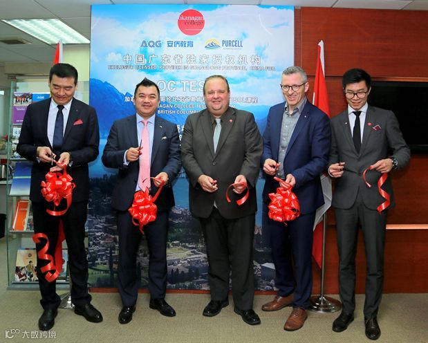 奥肯那根学院国际教育总监罗素·鲍利斯先生(Mr. Russel Boris)(右三)、珀塞尔国际教育有限公司总裁邓肯•麦克劳德先生(Mr. Duncan MacLeod)(右二)、AQG安侨教育首席执行官陆峰先生(Mr. Arthur Luk)(左二)、AQG安侨教育投资部总监刘宜明先生(Mr. Paul Liu)(左一)和AQG安侨教育大温哥华地区市场总监黄毅朗先生(Mr. Seiko Huang)(右一)共同剪彩,标志着AQG安侨教育正式成为奥肯那根学院TESOL课程中国广东省独家授权机构