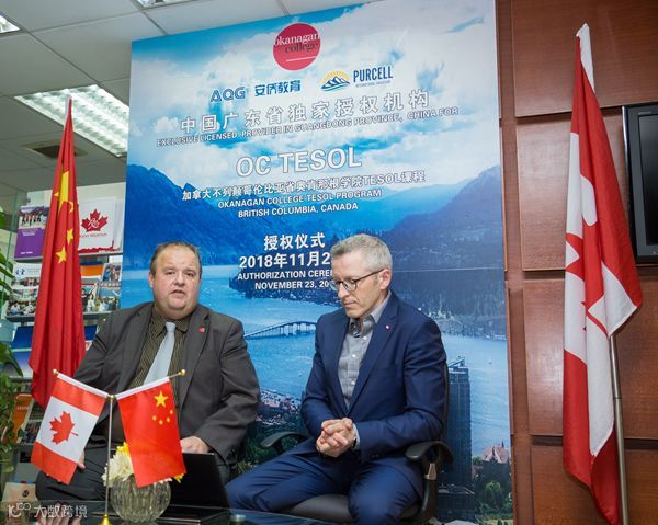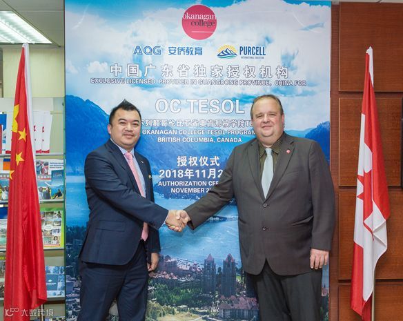 2018年11月22日,AQG安侨教育经加拿大不列颠哥伦比亚省(简称BC省)奥肯那根学院(Okanagan College)正式授权为其TESOL课程中国广东省独家授权机构。授权仪式上,奥肯那根学院国际教育总监罗素·鲍利斯先生(Mr. Russel Boris)、珀塞尔国际教育有限公司总裁邓肯•麦克劳德先生(Mr. Duncan MacLeod)、AQG安侨教育首席执行官陆峰先生(Mr. Arthur Luk)、AQG安侨教育投资部总监刘宜明先生(Mr. Paul Liu)和AQG安侨教育大温哥华地区市场总监黄毅朗先生(Mr. Seiko Huang)共同剪彩,将享誉国际的TESOL课程引进广东省。