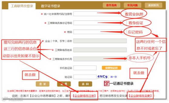 2、填写工商联络员信息并登陆,或根据系统要求采用电子营业执照、CA证书等方式登录;