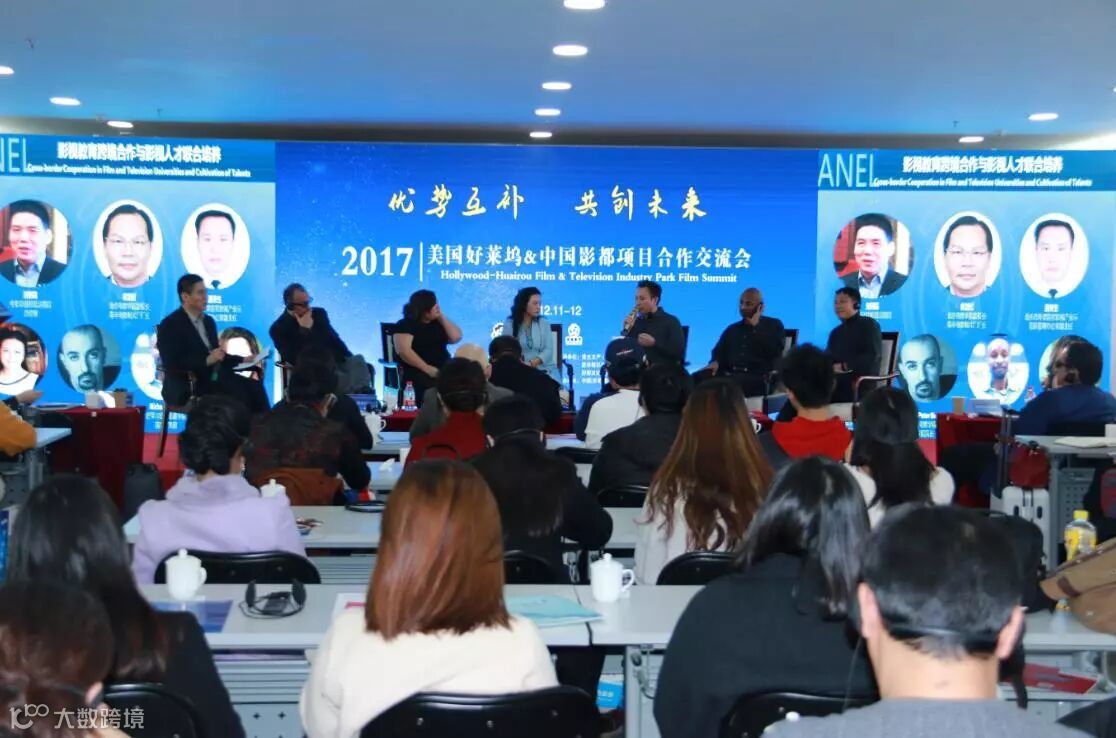 2017美国好莱坞&中国影都项目合作交流会于12月12日在国家中影数字制作基地举行,百余家影视文创类企业及投资机构包括中影股份、星美影视城、博纳影业、国奥公司、乐视、北京文投、爱奇艺、阿里等企业到会交流。活动由瀚海洛杉矶文创园Hanhai Studio总经理韩丽主持,中美嘉宾就中美影视产业合作与影视人才培养两个主题进行了精彩的论坛讨论。