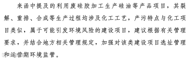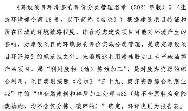 环境部新近就《环评分类管理名录》适用复函 环办环评函〔2022〕223号 关于利用废硅胶加工生产硅油等产品项目行业类别和环评类别判定事宜的复函 明确: