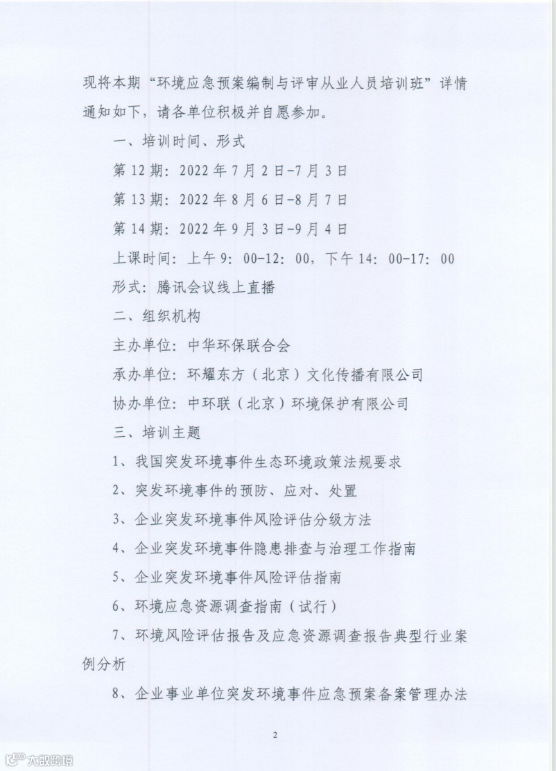 1、培训费用:3000/人,培训结束后颁发《环境应急预案》、《环境风险评估》两本培训证书