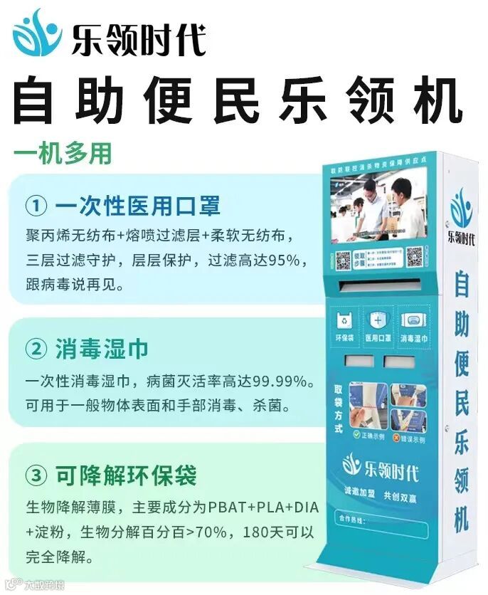 需要使用口罩/消毒湿巾/环保袋时,乐领时代全天候都可以免费提供,并根据所在场景,获取相关有价值的资讯。