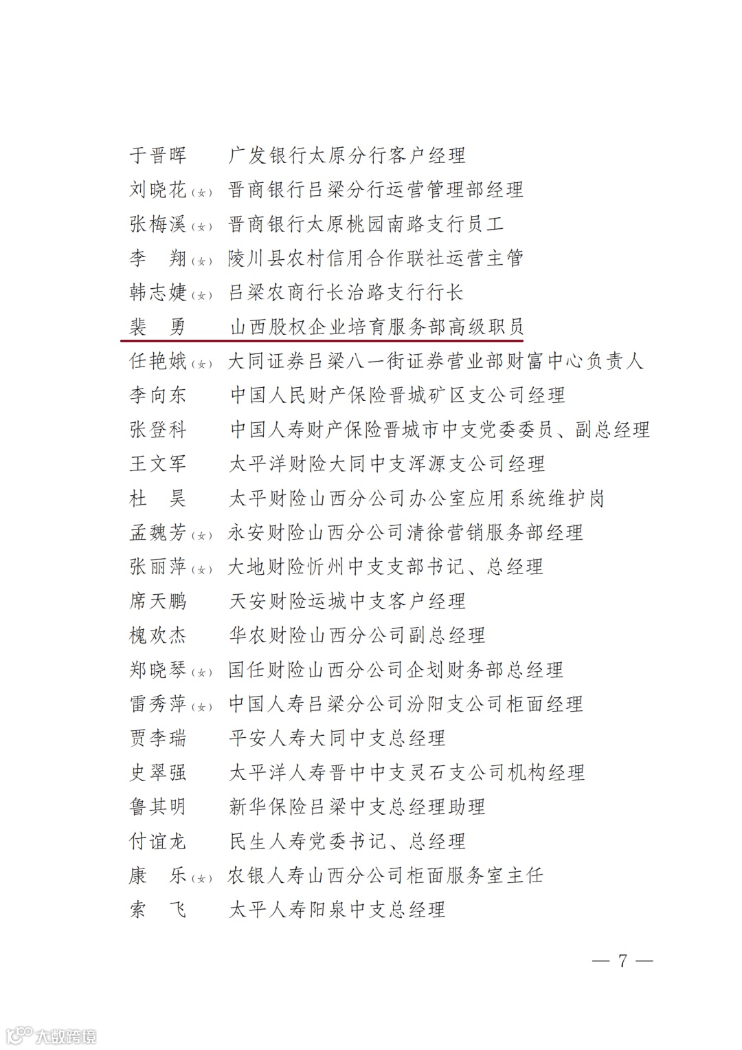 山西省金融系统“建功十四五 奋进新征程”优质服务竞赛标兵个人:裴勇 山西股权企业培育服务部高级职员