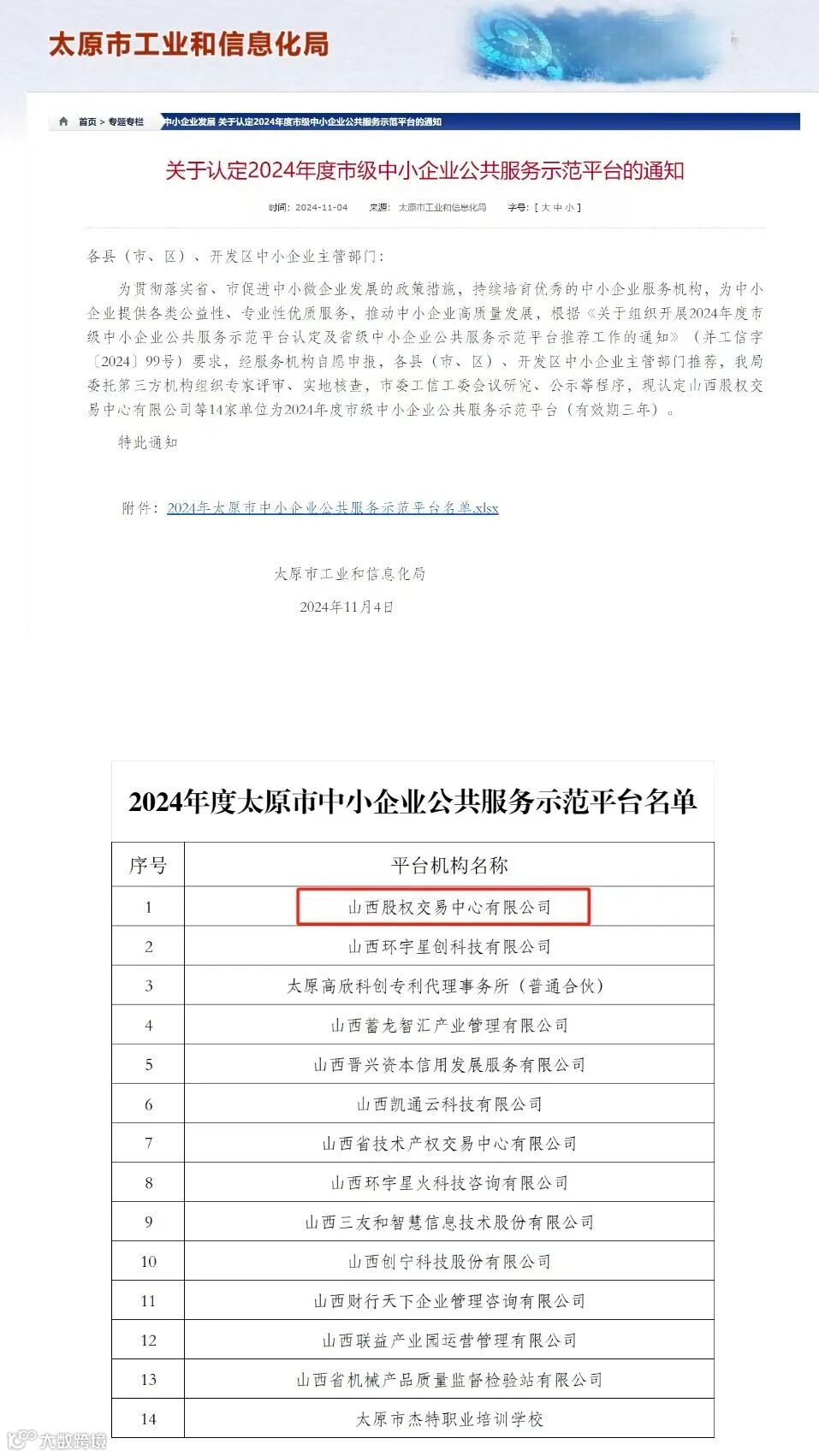喜报!山西股交被认定为2024年度太原市中小企业公共服务示范平台