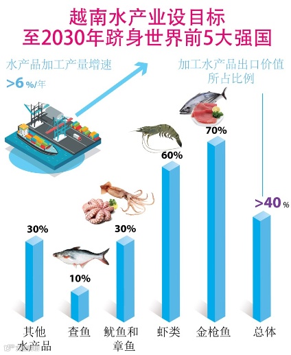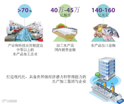 越南政府总理刚刚发布第1408号决定,正式批准水产加工业发展提案(2021-2030年阶段),目标为力争将越南打造成全球主要水产加工中心并跻身世界5大水产大国之列,水产加工的国内销售额为40-45万亿越盾,水产出口额为140-160亿美元等