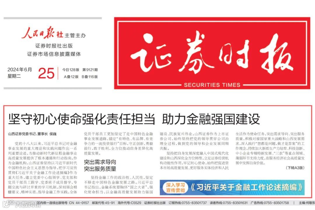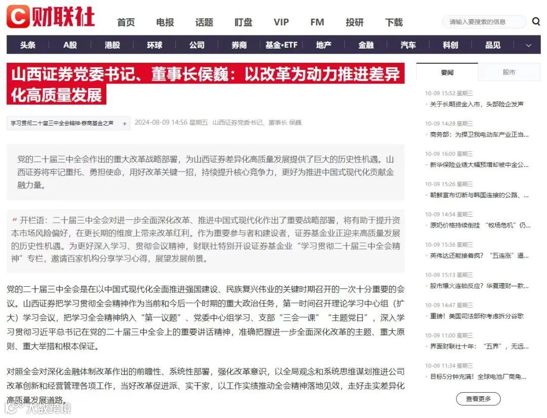 报道了关于“山西证券党委书记、董事长侯巍:以改革为动力推进差异化高质量发展”的新闻。