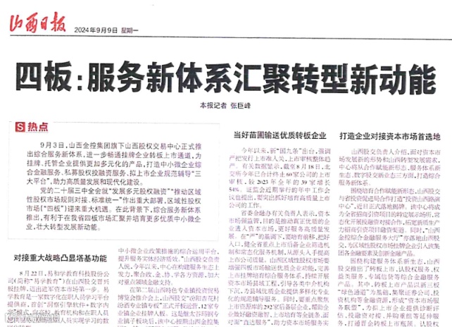 【编者按】近年来,山西金控集团紧紧围绕省委省政府决策部署,充分发挥功能作用,积极探索、扎实推进金融“五篇大文章”,把服务新质生产力作为关键着力点放在更加突出位置,为推进我省经济高质量发展提供有力金融支持。小编整理了三季度媒体刊登发布的集团及子公司6家单位20篇相关报道,一起来看看!