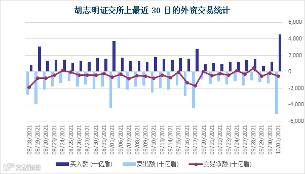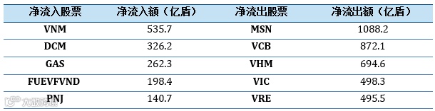 在胡志明证交所HOSE外资净流出5,438.8亿盾。河内证交所HNX外资净流入1,231.8亿盾。