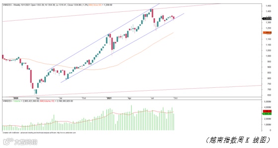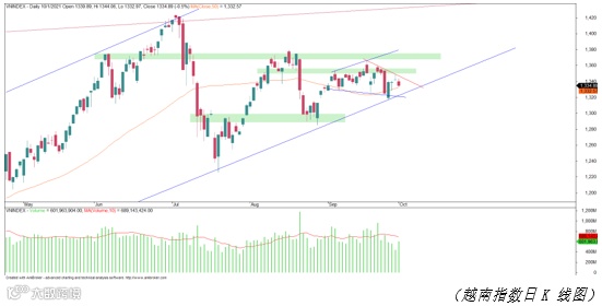 具体,周一指数开盘后大幅下跌,收盘于日中最低位,成交量不太大。原因可来自市场对2021年三季度GDP负增长的消息(负增长率高于所预料)提前产生了反应。周二VNINDEX继续低开,不过快速逆转复苏并保持随后大部分时间都上涨,最终指数收盘接近日中最高位。周三 GDP信息正式公布,但之前市场已经预料到所以当日该信息对市场产生不大影响。周四 指数上涨但资金流入微弱,当日成交量及成交额都很低,收盘点也回落接近开盘点并远低于日中最高位。该走势反映了市场心里的谨慎,不愿意在高价入仓。周五,VNINDEX下调,在新低点位购买力再次缓解了卖压,体现在当日成交量大于前三日的成交量,不过仍低于日均水平。