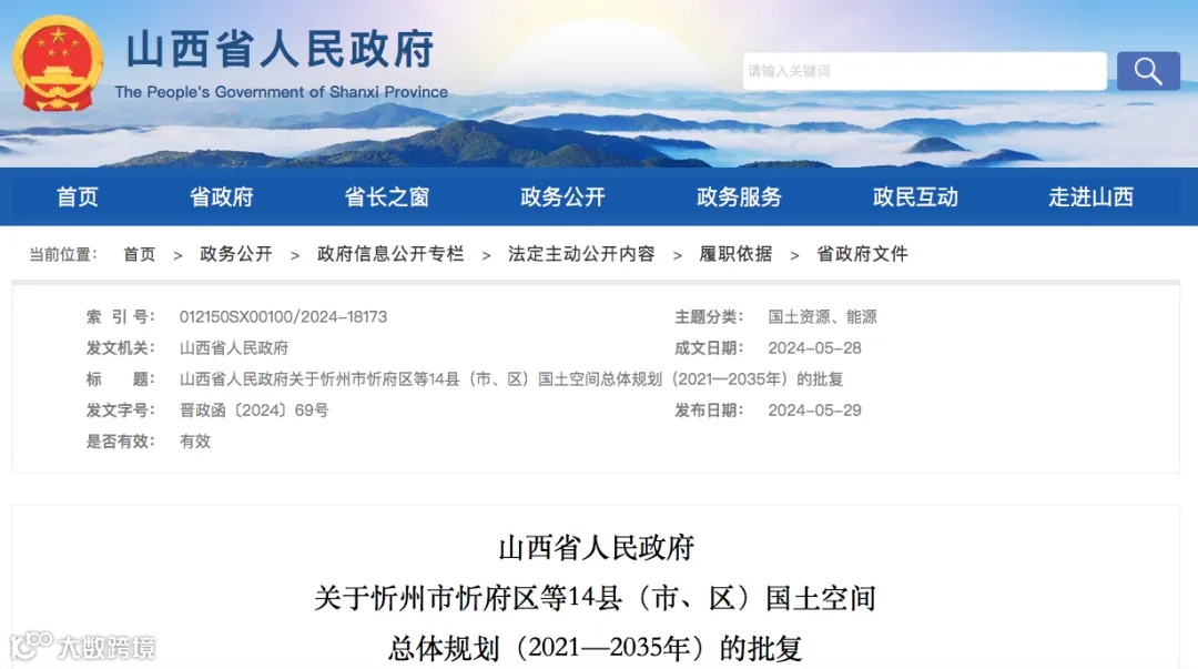 山西省人民政府“关于3市县(市、区)国土空间总体规划(2021-2035年)的批复”公开发布。