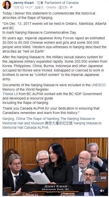 近日,加拿大联邦新民主党(NDP)华裔国会议员关慧贞(Jenny Kwan) 在国会众议院就南京大屠杀80周年发表声明,呼吁联邦政府把12月13日定为南京大屠杀国家纪念日。