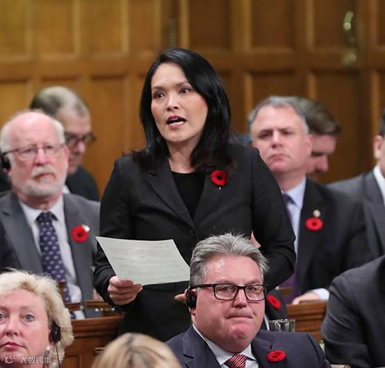 加拿大联邦新民主党(NDP)温哥华东区国会议员关慧贞发表声明。出席了2017广东省赴加拿大BC省MOU暑期学游欢迎仪式的,同是NDP的加拿大国会议员韦恩•斯特斯基先生(Mr. Wayne Stetski)也出席了此次联邦议会,坐在了关慧贞身后,并在她发表声明后与其他众多议员起立鼓掌。