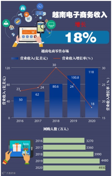 据越南工贸部电子商务和数字经济局刚发布的《2021年越南电商白皮书》显示, 越南电子商务收入在过去5年中持续大幅增长。