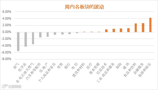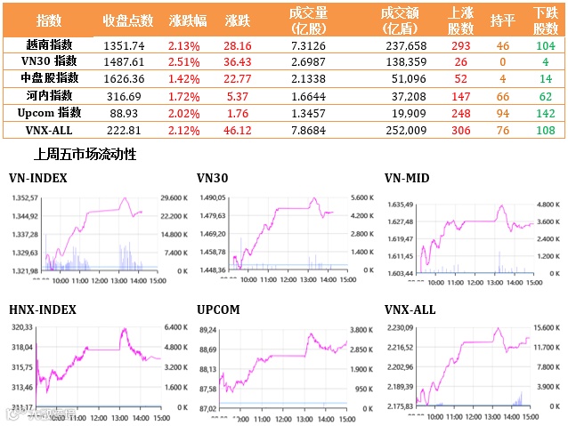 至于行业而看,上周旅游娱乐行业走势最积极,代表是VJC 涨7.5%、越南航空HVN 涨7.1%;其次是证券(属于金融服务板块),代表是先锋证券ORS涨9.5%、越资证券VCI涨8%、VNDirect 证券涨5.3%。前两周涨幅最大的石油和化工行业,上周已经有所下滑,包括:石油钻探和钻探服务PVD跌7.2%、越南石油总公司OIL跌5.8%、越南石油集团PLX跌5.65和工业橡胶GVR、德江化学品和洗衣粉DGC 分别下调2.5%和2.4%。
